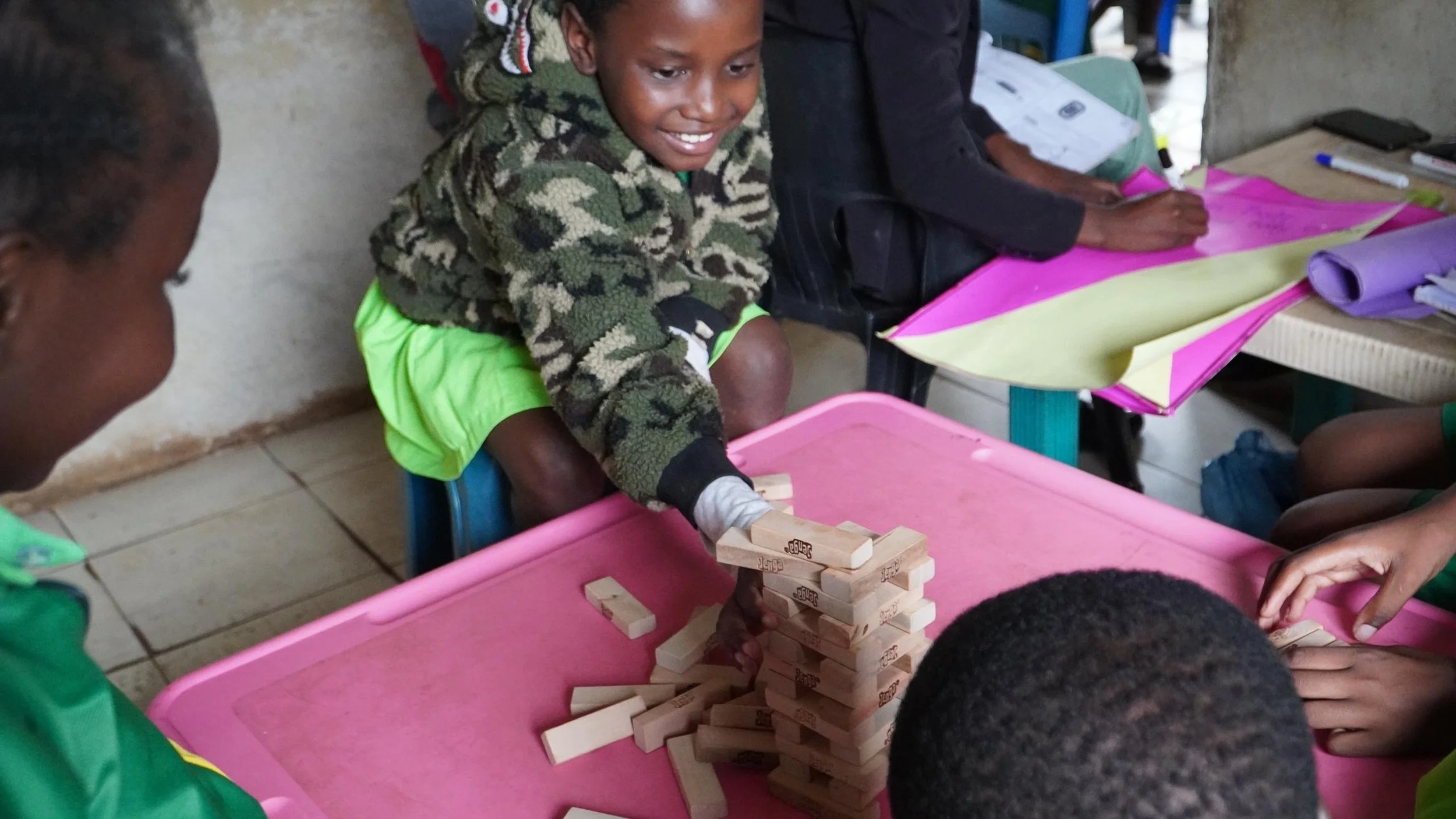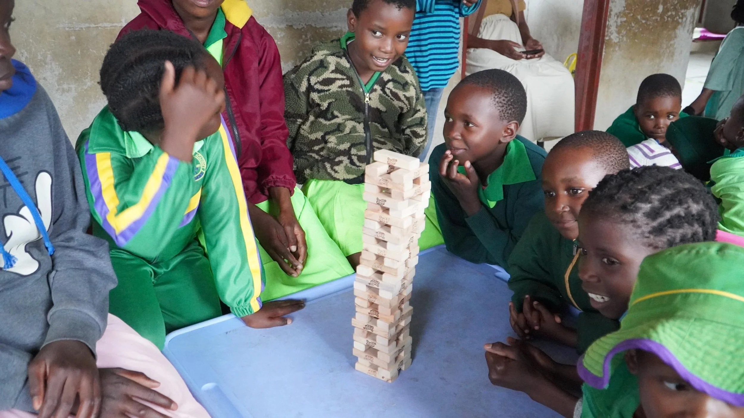 Spark students at Minne Lusa learn about honesty using a Jenga game.